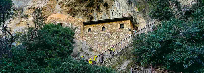 Κάπου εκεί κρυμμένο στην αγκαλιά του βράχου βρίσκεται το ασκηταριό της Σφυρίδας, ένα μικρό σπήλαιο με ιδιαίτερη ενέργεια, όπου σύμφωνα με την παράδοση ασκήτεψαν μοναχοί αιώνες πριν.